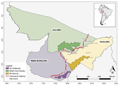 The MAP region is a transboundary area in the south-western Amazon, covering the states of Madre de Dios (Peru), Acre (Brazil) and Pando (Bolivia). Due to its unique combination of factors, the region is considered an ideal place to study how infrastructure development, different land uses, nature conservation and institutional structures evolve across national borders and in the context of climate change.